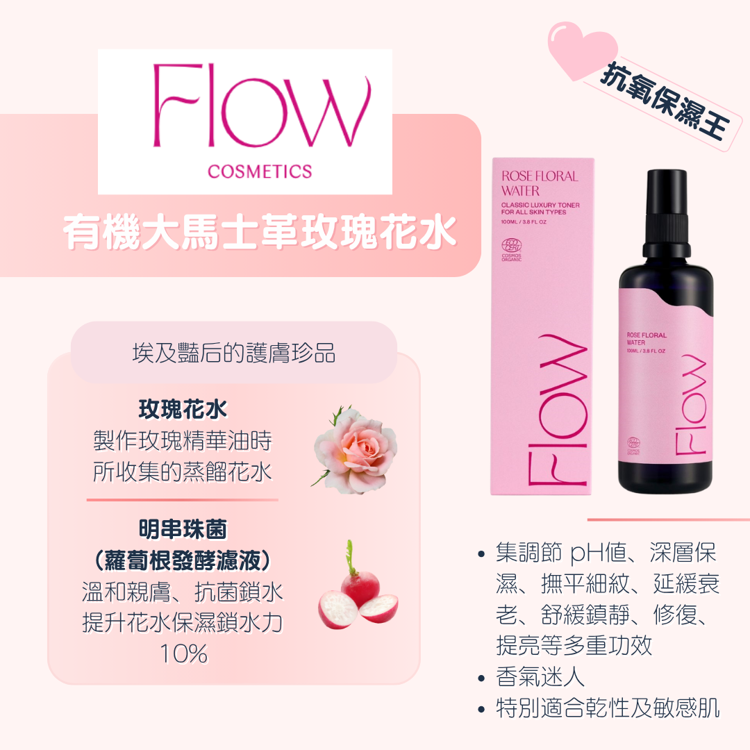 • 100% 純天然,是製作玫瑰精華油時所收集的蒸餾花水,集調節 pH值、深層保濕、撫平細紋、延緩衰老、舒緩鎮靜、修復、提亮等多重功效。