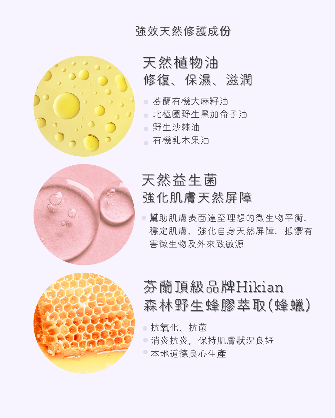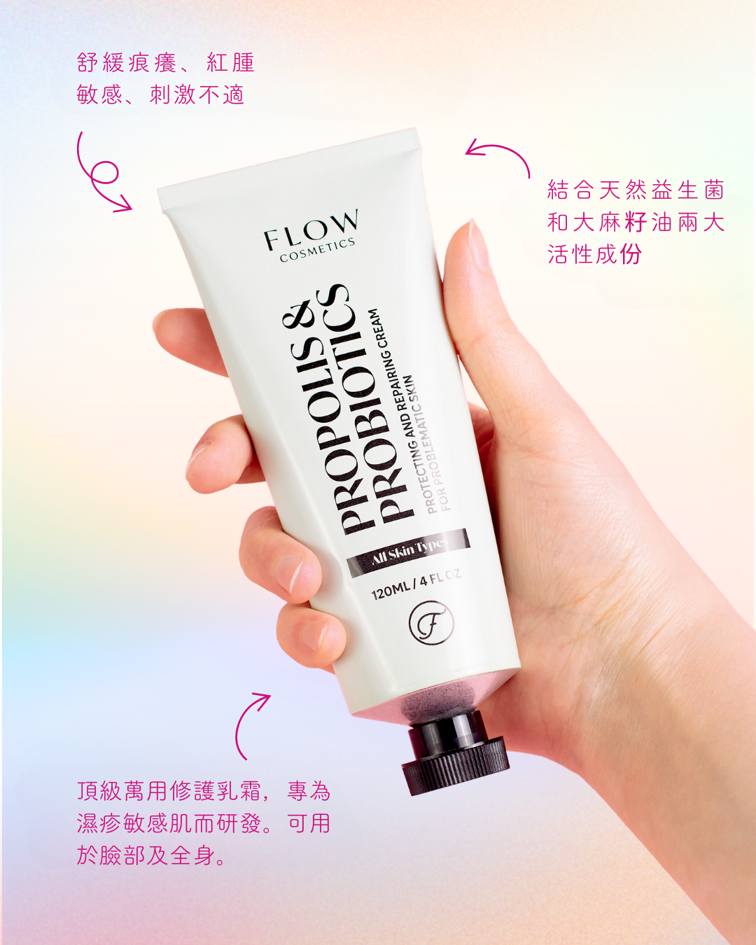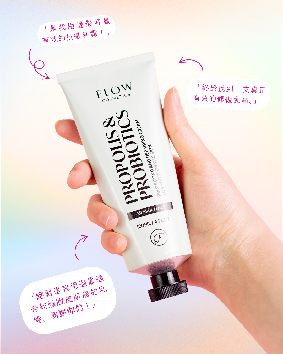 經過多年研發,FLOW COSMETICS 蜂膠益生菌抗敏止痕修復霜終於誕生了。這款修復霜100%天然,結合多款強效的天然修復活性成分,為紅疹、敏感刺激、痕癢、濕疹和銀屑病等問題肌膚帶來一線曙光。自北歐上市以來,已獲得眾多用家實證好評,這支修復霜能大大舒緩皮膚過敏不適,讓您不再擔心因長期使用類固醇而出現的副作用及依賴性。