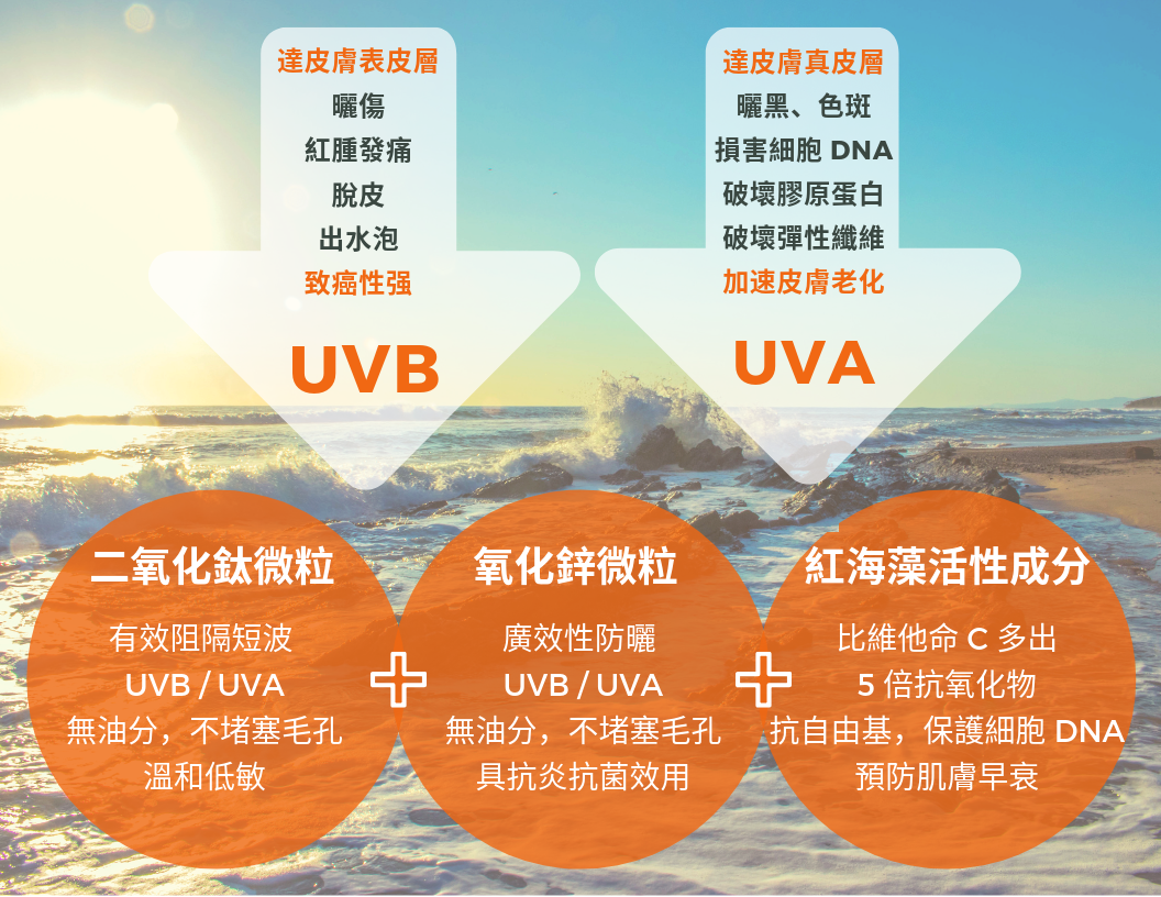 根據權威機構 EWG 2019 防曬指南,只有氧化鋅及二氧化鈦被證實為安全的防曬成分,而且在測試中證實氧化鋅較常見的化學防曬成分更有效扺抗 UVA / UVB,達致廣效性防曬效果。