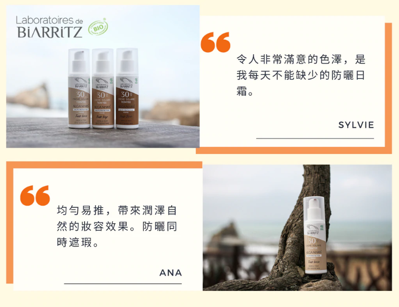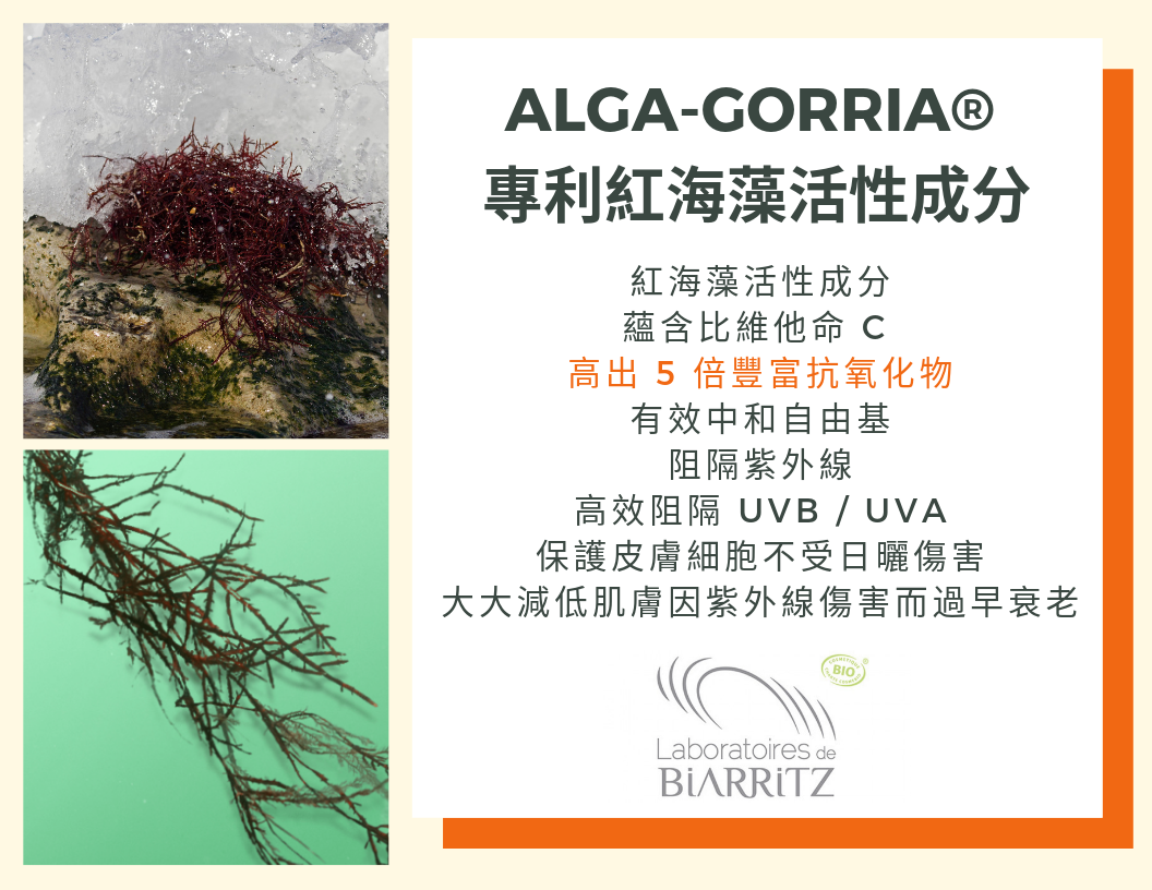 LABORATOIRES de BIARRITZ 有機紅海藻多效修護防曬面霜 SPF30 揉合【Alga-Gorria® 專利紅海藻活性成分】,此成分提煉自一種名叫 Gelidium sesquipedale 的紅海藻,為法國巴斯克海岸線所獨有。為了更好地控制產品的質量及減少碳排放,從研究到產品製成,全程法國製造。