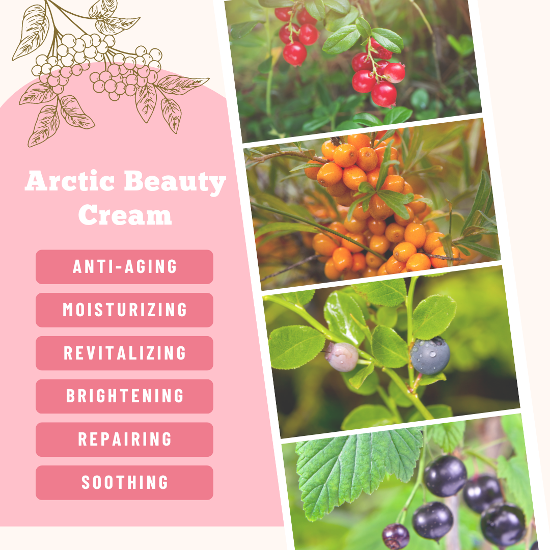 Arctic Beauty Cream, with hyaluronic acid, strengthens the skin, increases elasticity, protects the skin against premature aging and brightens the complexion. Arctic berry seed oils together with bisabolol act as fat-based moisturizers, softening and strengthening your skin. The product contains first-class antioxidant protection against signs of aging, keeping your skin smooth and elastic.