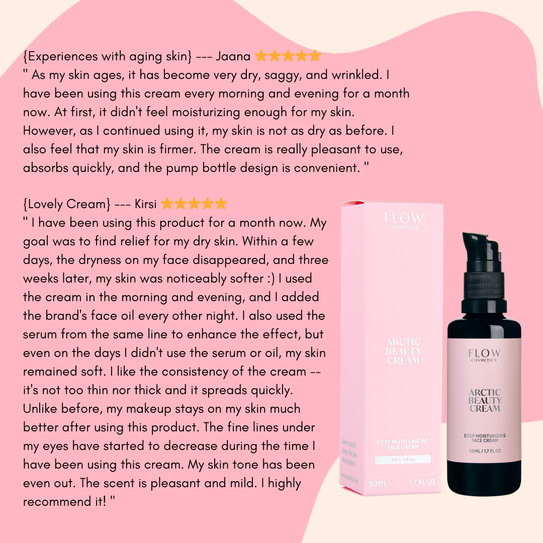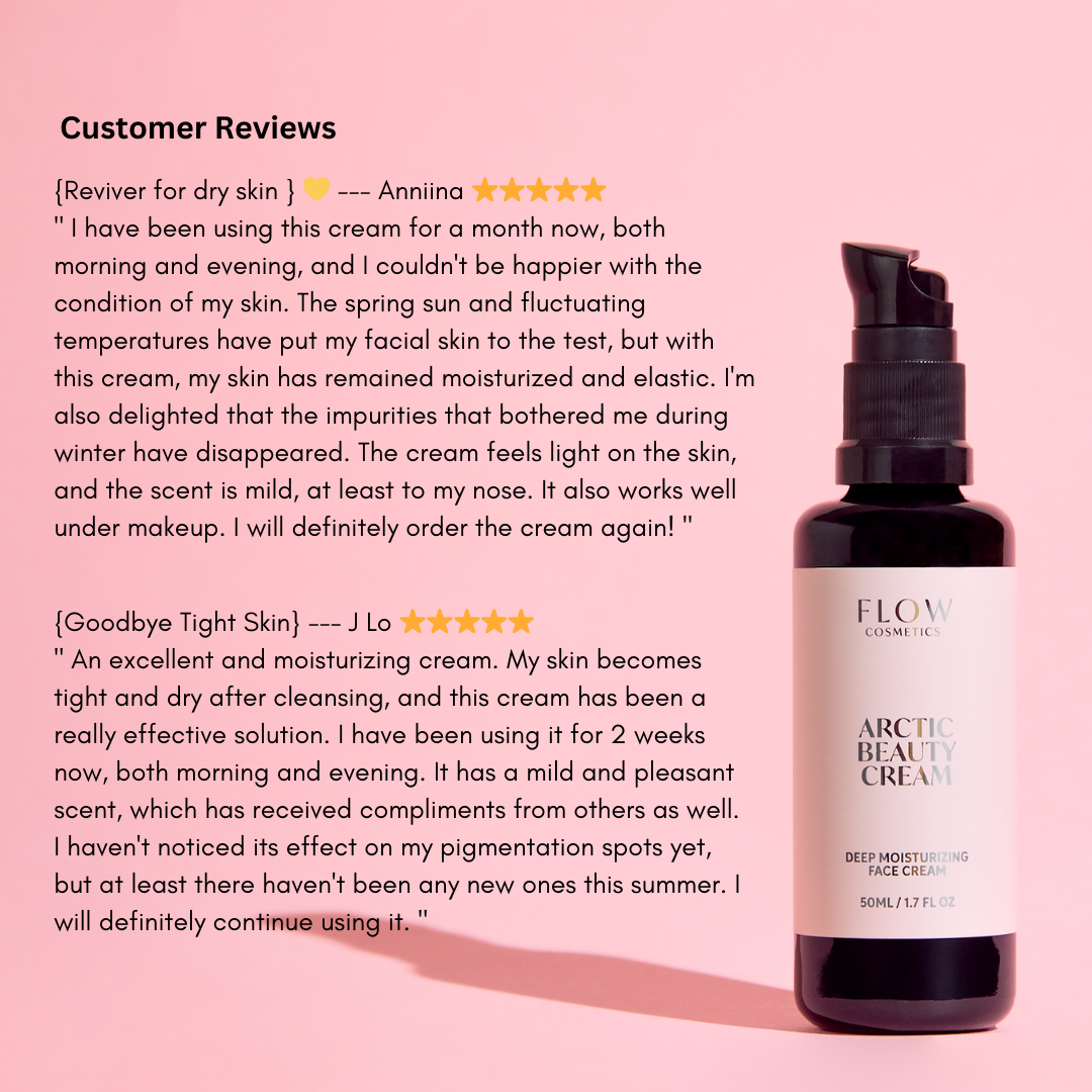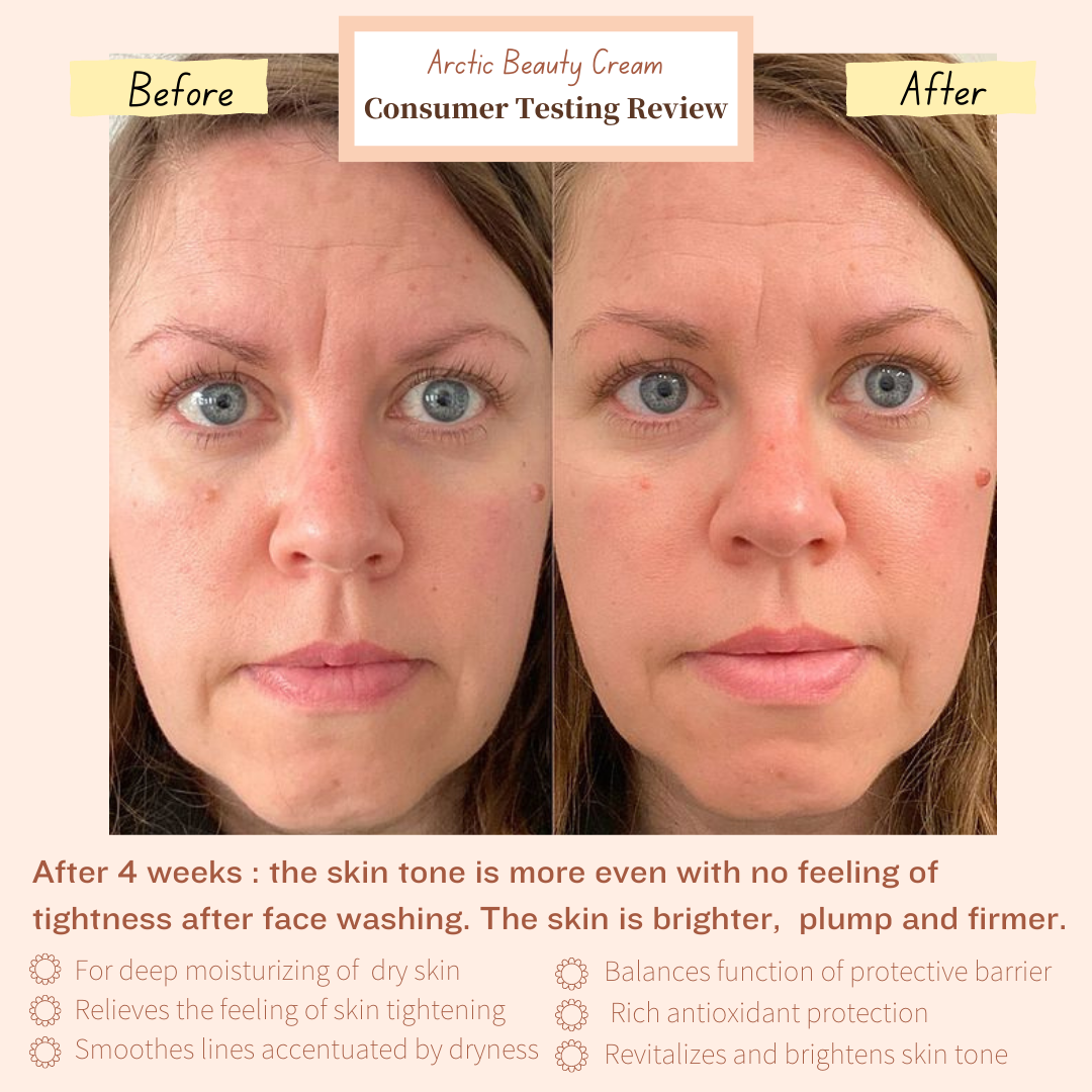 Arctic Beauty Cream meets the challenges of dry skin by helping the skin bind moisture and keep moisture in the skin. Hyaluronic acid of two different molecular sizes is responsible for water-based hydration.
