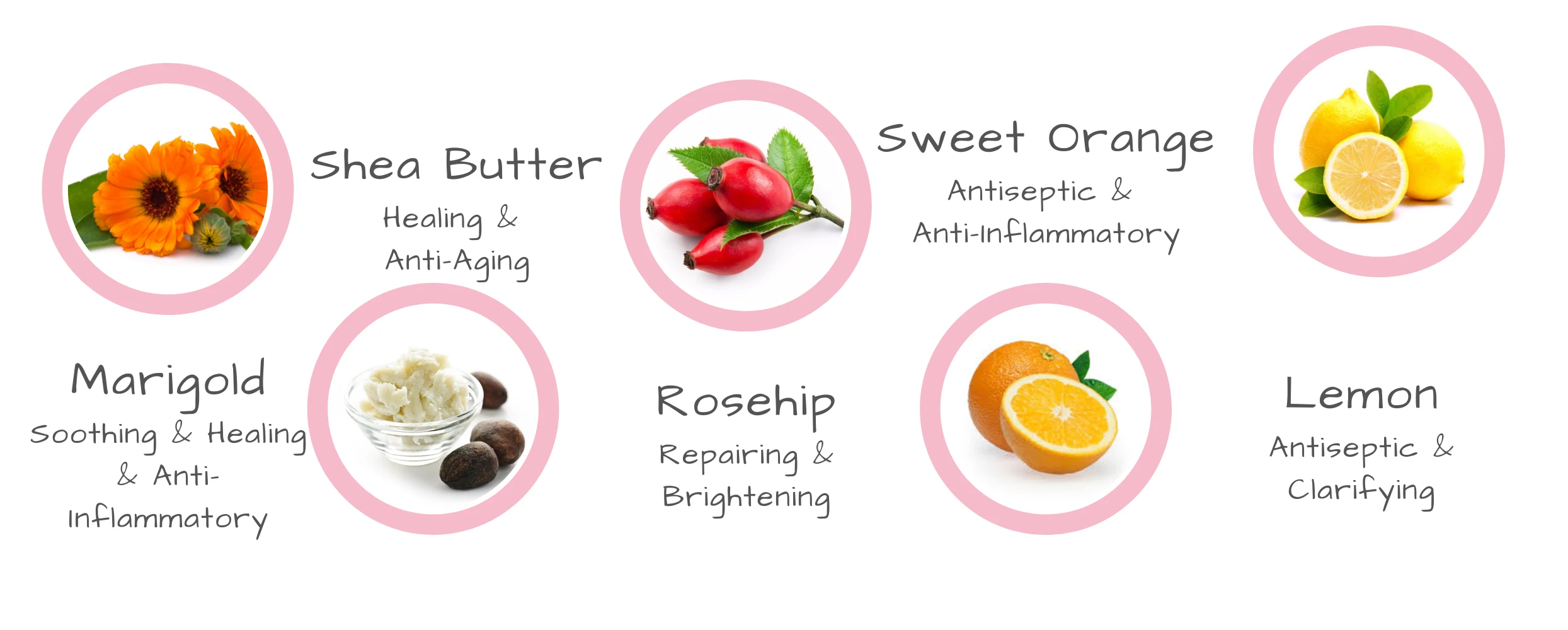 organic sheabutter, organic marigold extract, organic rosehip seed oil, organic orange essential oil, organic lemon essential oil, organic tea tree essential oil, organic ginger essential oil, organic rosemary leaf extract extracted in organic sun flower seed oil.