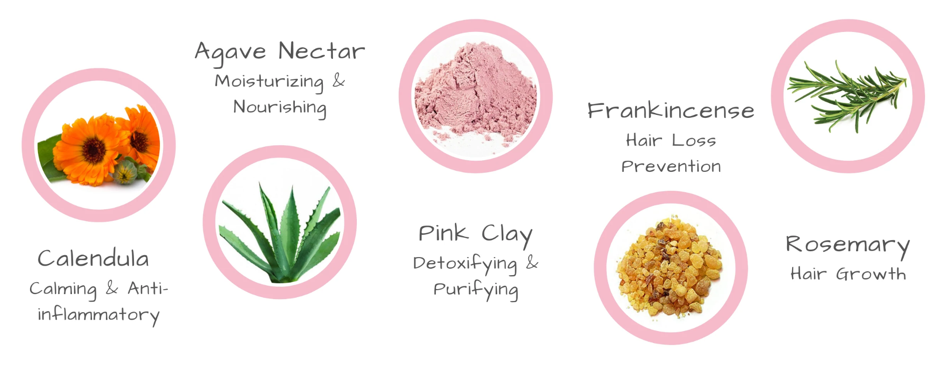 organic coconut oil, organic sesame seed oil, glycerin, water, organic castor oil, organic agave nectar, organic marigold, organic lemon essential oil, organic litsea cubeba essential oil, organic frankincense essential oil, pink clay, rganic rosemary leaf (antioxidant) extracted in organic sunflower seed oil.