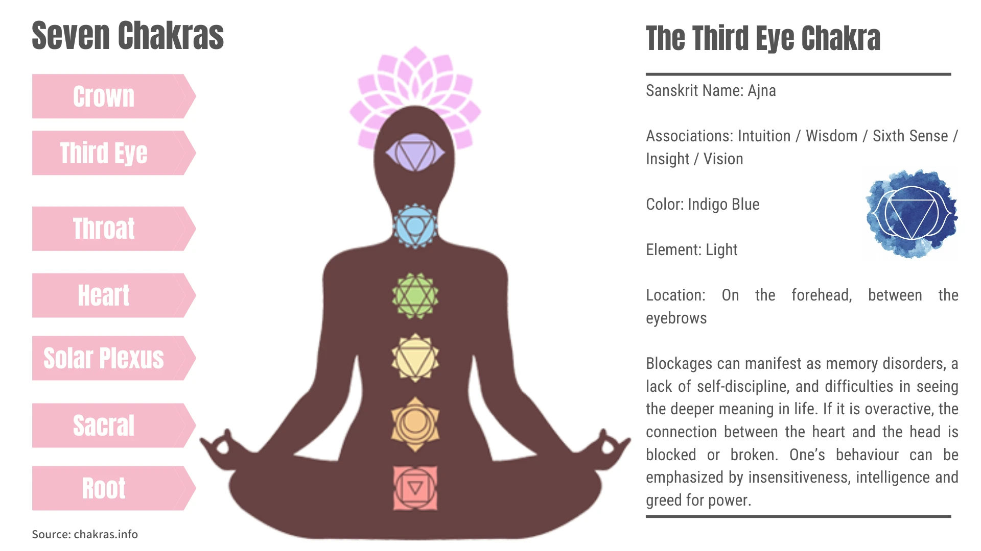 Blockages in the third eye chakra can manifest as memory disorders, a lack of self-discipline, and difficulties in seeing the deeper meaning in life. When this chakra is overactive, the connection between the heart and the head is blocked or broken. One’s behaviour can be emphasized by insensitiveness, intelligence and greed for power.