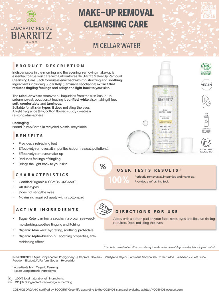 Enriched in hydrating and soothing ingredients, the certified Organic Face, Eyes & Lips Micellar Water removes make-up and effectively cleanses the skin. It eliminates the impurities and makeup that accumulate throughout the day, soothing discomfort and reviving radiance.