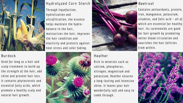 Hydrolyzed corn starch and beetroot extract help maintain the hydro-balance in the hair, it moisturizes the hair, improving the hair condition, making the hair more elastic and protects against heat stress and colour fading. Burdock is known for building up the strength of the hair and adding shine.