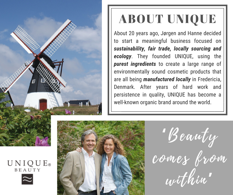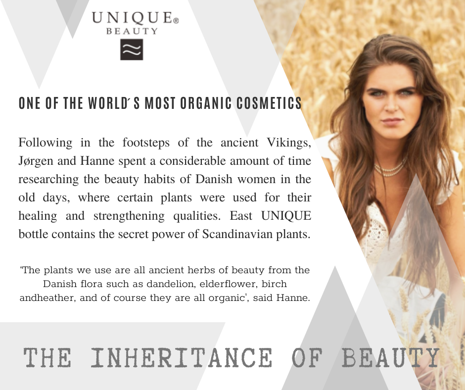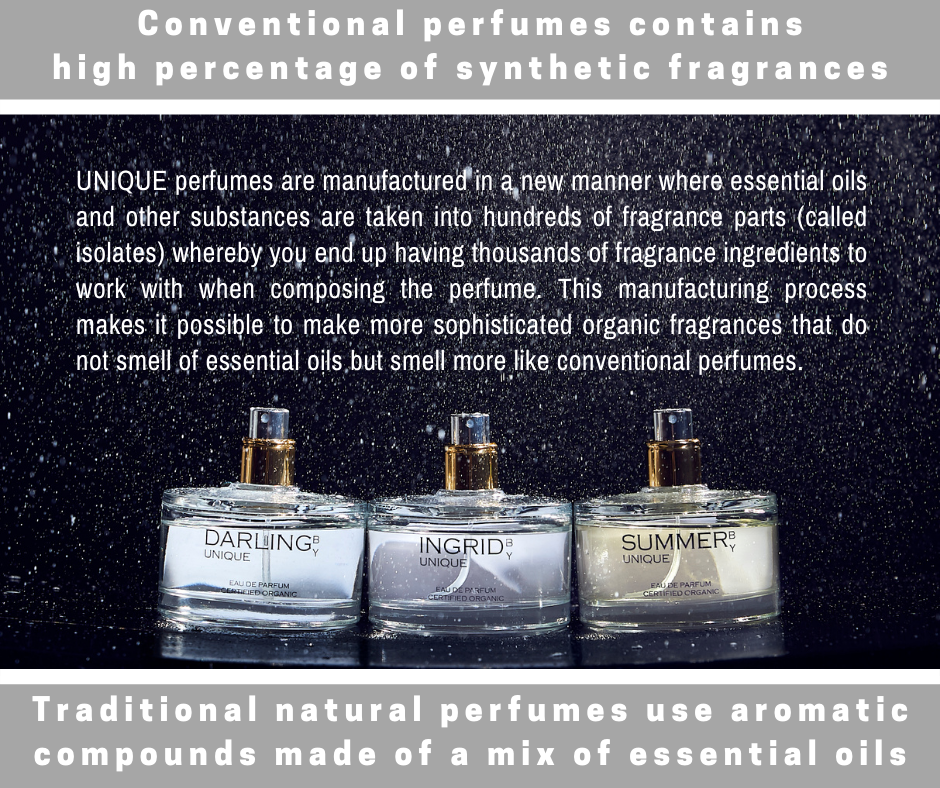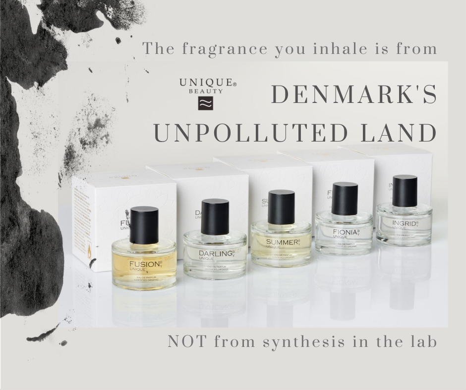 UNIQUE perfumes are 100% natural with ingredients such as flowers, grasses, leaves, fruits, wood, roots and seeds. Even the alcohol and fixatives are derived from plants. UNIQUE uses high-tech fragrance extraction to break essential oils and other substances into hundreds of fragrance parts, and thus makes it possible to make more sophisticated organic fragrances that do not smell of essential oils but smell more like conventional perfumes.
