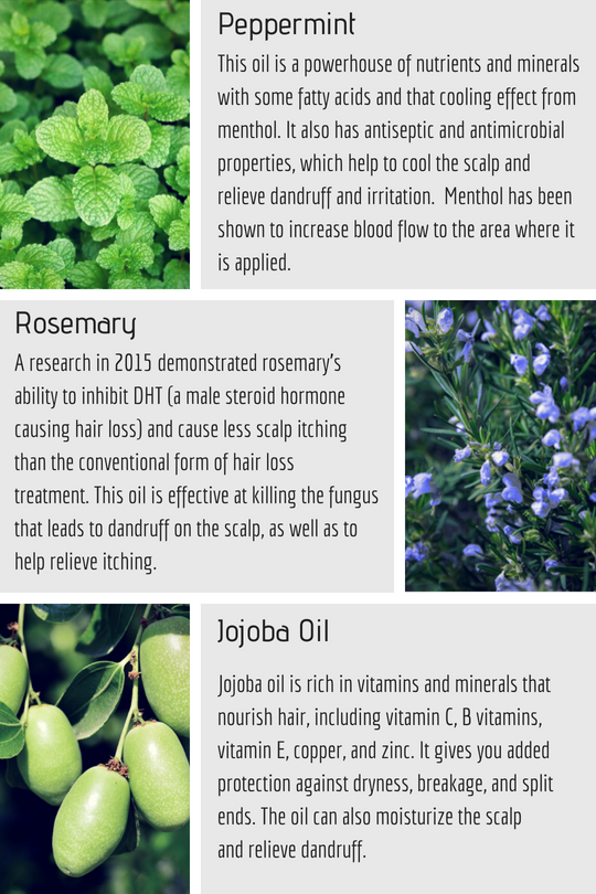 The menthol in peppermint has a cooling effect on the scalp and has been shown to increase blood flow to the area where it is applied. Rosemary and omega-3 not only helps prevent hair loss and breakage, but encourages healthy, lush hair and the growth of new hair. Vitamins F and organic jojoba oil combat dryness, moisturizes the scalp and protect against hair breakage and split ends.