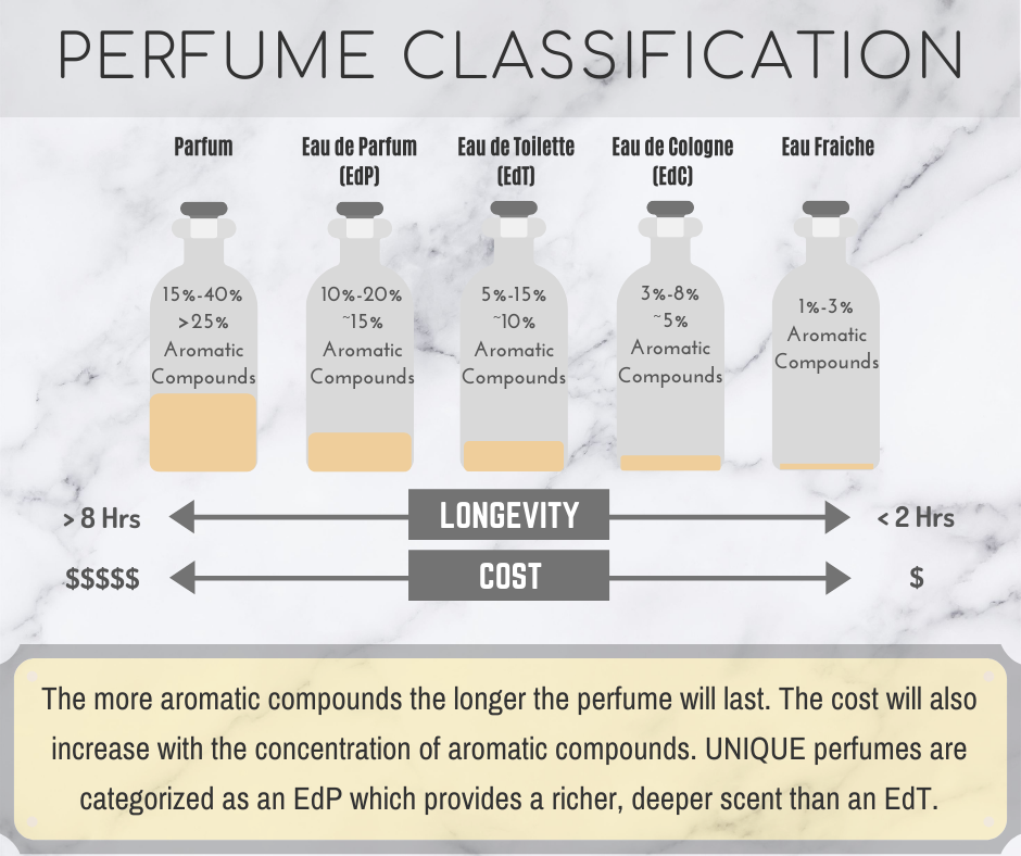 The more aromatic compounds the longer the perfume will last. The cost will also increase with the concentration of aromatic compounds. UNIQUE perfumes are categorized as an EdP which provides a richer, deeper scent than an EdT.