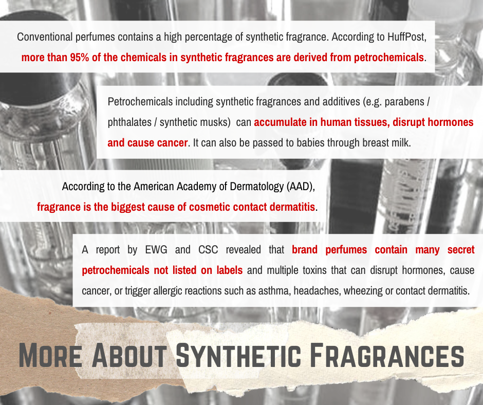Are you aware that the perfumes you apply on your body and inhale is from the synthesis process in the lab? And they are harmful? A report by EWG and CSC revealed that brand perfumes contain many secret petrochemicals not listed on labels and multiple toxins that can disrupt hormones, cause cancer, or trigger allergic reactions such as asthma, headaches, wheezing or contact dermatitis.