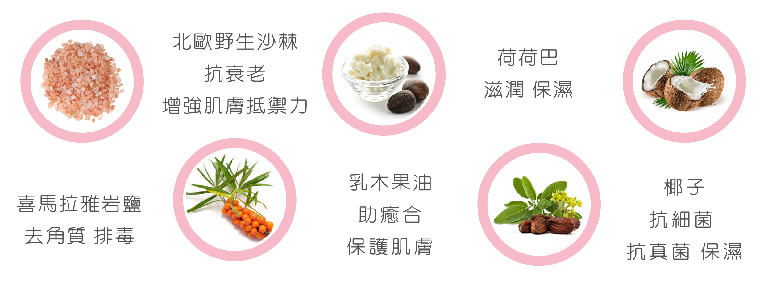 - 粉紅色的喜馬拉雅岩鹽是地球上最純淨的鹽,富含礦物質,被肌膚吸收後有助修復肌膚損傷及皮炎、皮疹、瘙癢、暗瘡和異位性皮膚炎等問題,還有助平衡肌膚的 pH 值。