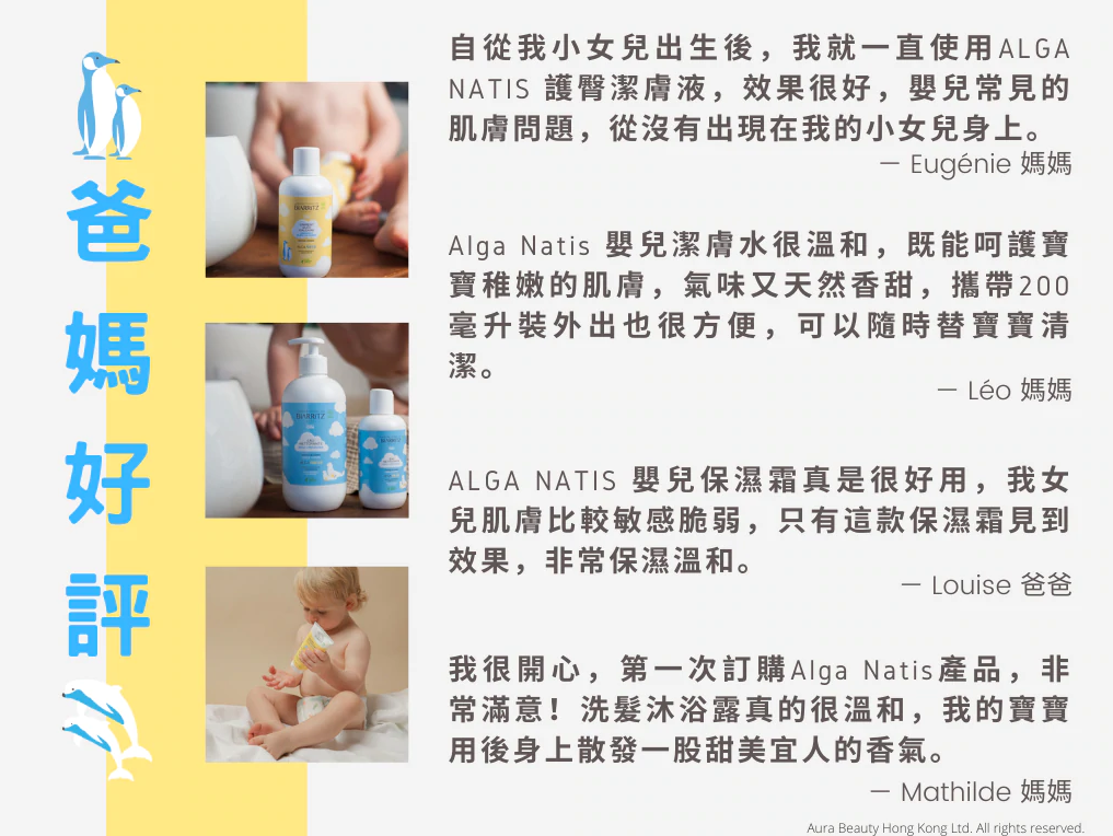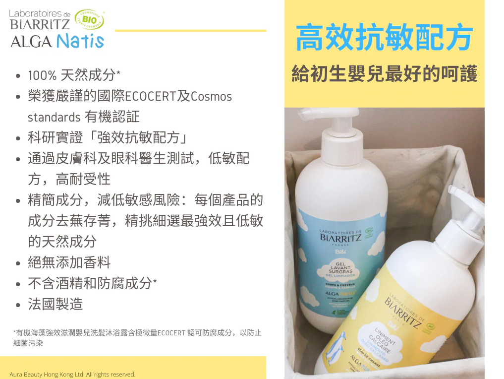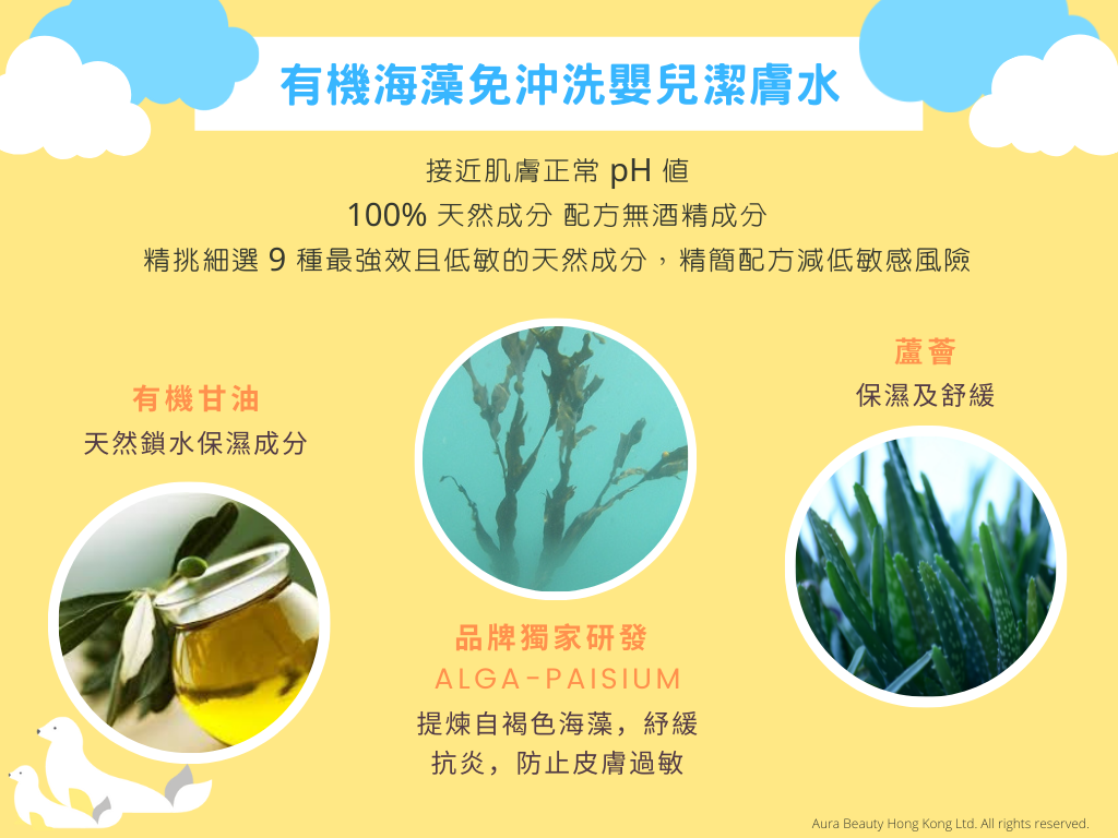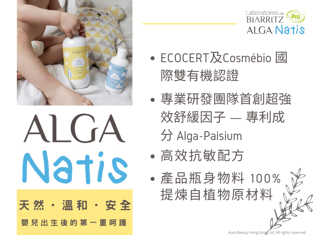 專業研發團隊首創超強效舒緩因子 Alga-Paisium,提煉自褐色海藻 (Fucus Vesiculosus),有效舒緩嬰兒的嬌嫩肌膚,防止皮膚過敏及發炎,溫和地清潔初生嬰兒嬌嫩的肌膚,清除肌膚上的雜質,不會刺激嬰兒幼嫩且未臻成熟的肌膚表皮。高效抗敏配方糅合滋潤舒緩因子,維持肌膚的天然平衡狀態。