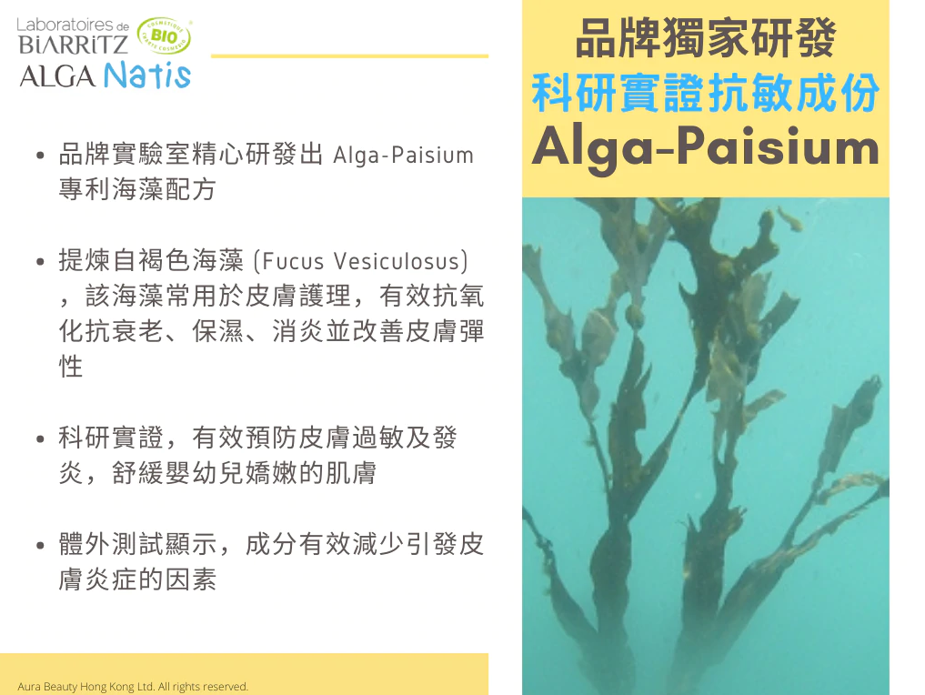 蘊含專業研發團隊首創超強效舒緩因子 —— Alga-Paisium,提煉自褐色海藻 (Fucus Vesiculosus),舒緩及防止初生嬰兒的皮膚過敏及發炎症狀,體外測試顯示成分有效減少引發皮膚炎症的因素。
