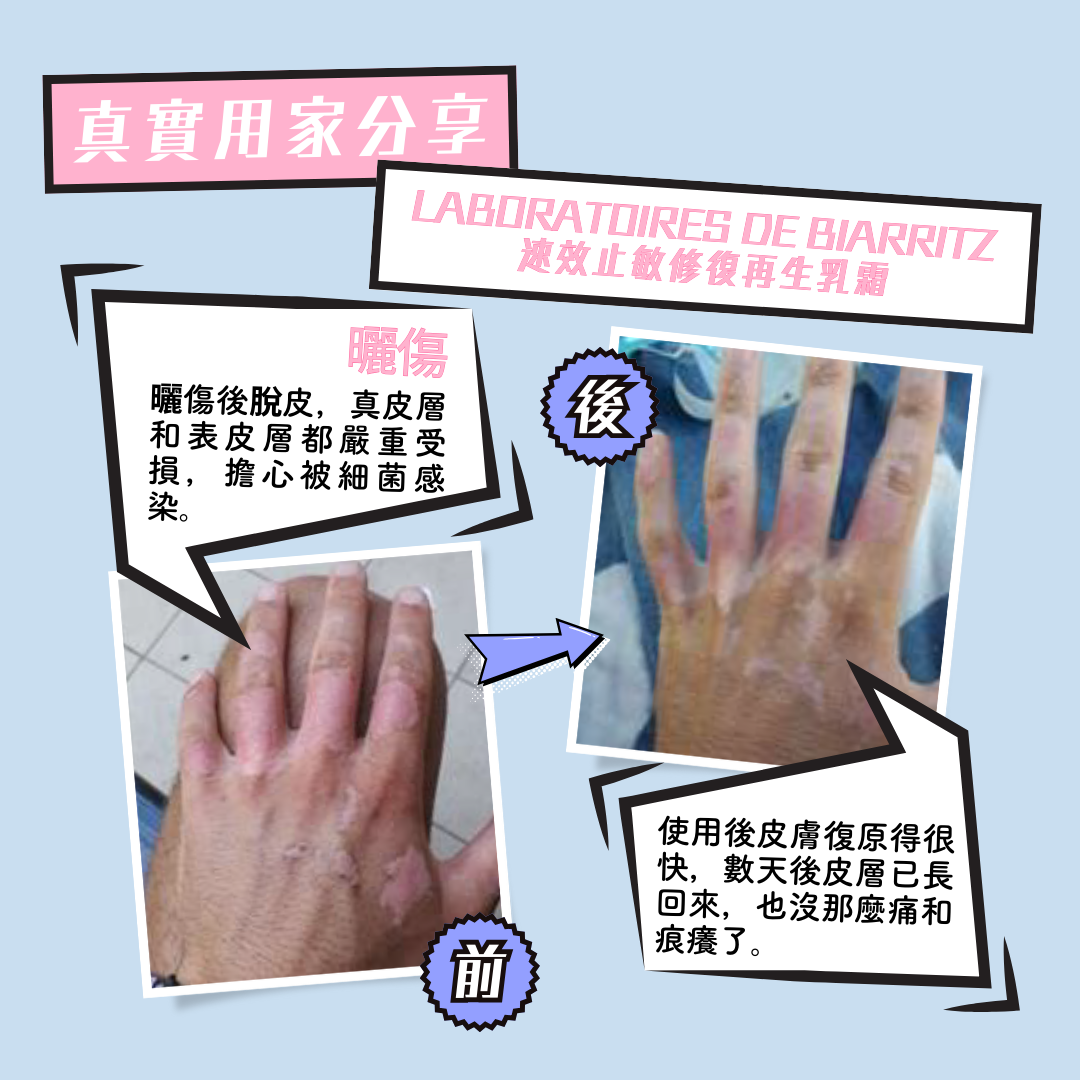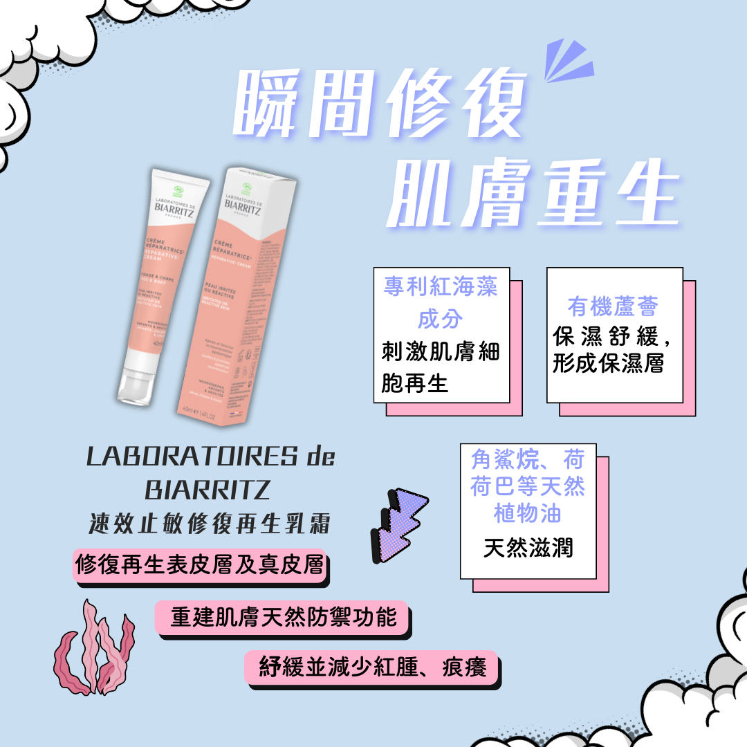 針對受損肌膚、過敏或發炎皮膚,以獨家研發專利修復精華,先修復表皮層及真皮層,再加上天然磷脂(Natural Phospholipids)、有機蘆薈、蔬菜(橄欖)角鯊烷,有機乳木果油,有機荷荷巴油,有機琉璃苣油,有機西梅油,提供全面保濕和舒緩,形成保護層,讓肌膚回復健康狀態。