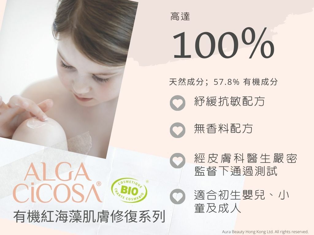 有機認證成分,抗敏低敏配方,無添加香料及酒精,無色不油膩。