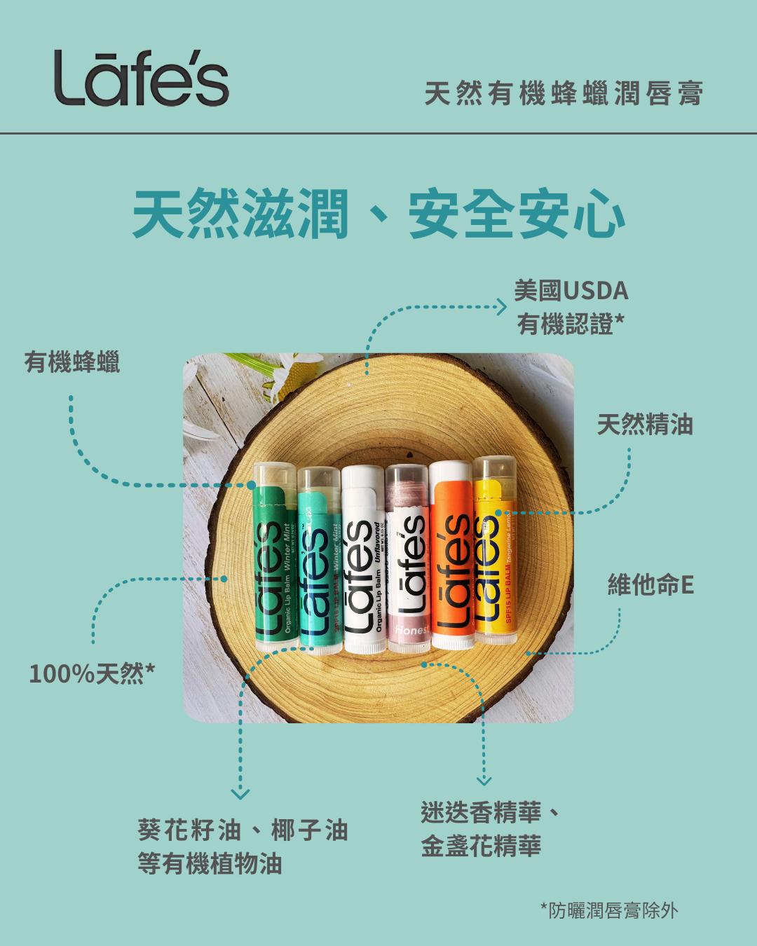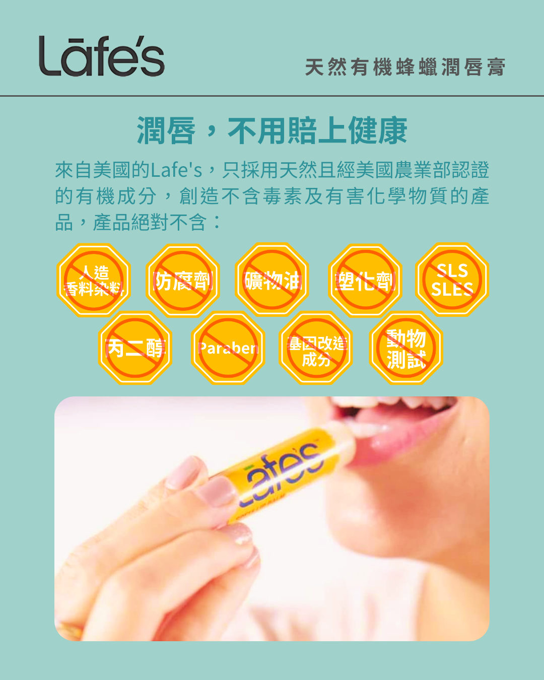 長效滋養及修護雙唇幼嫩肌膚。Lafe’s 有機蜂蠟潤唇膏讓雙唇柔軟、光滑,美國USDA有機認證。注滿一籃子滋潤修護的有機植物油和蜂蠟,深層滋潤唇部肌膚,修護敏感乾燥嘴唇,使嬌唇持久柔軟、水潤飽滿﹐預防秋冬天的爆坼脫皮情況出現,維持唇部肌膚健康。蘊含天然迷迭香及金盞花精華,舒緩唇部肌膚所受的刺激,並促進乾裂嘴唇快速癒合。特別加入有機薄荷葉精油、迷迭香及金盞花精華,讓嘴唇透出清新草本香氣。