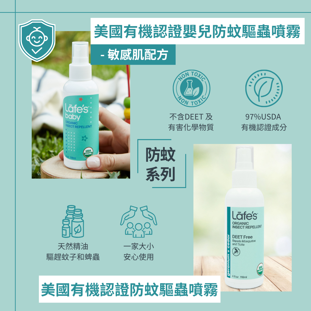通過美國農業部 USDA 有機認證,不含香茅、DEET避蚊胺、石油及有害合成化學物質,無麩質;採用純天然驅蚊成份天竺葵精油,有效驅除蚊子和蜱蟲,天竺葵比香茅更為溫和,對肌膚的刺激性較小。成人和嬰兒都可安心使用。