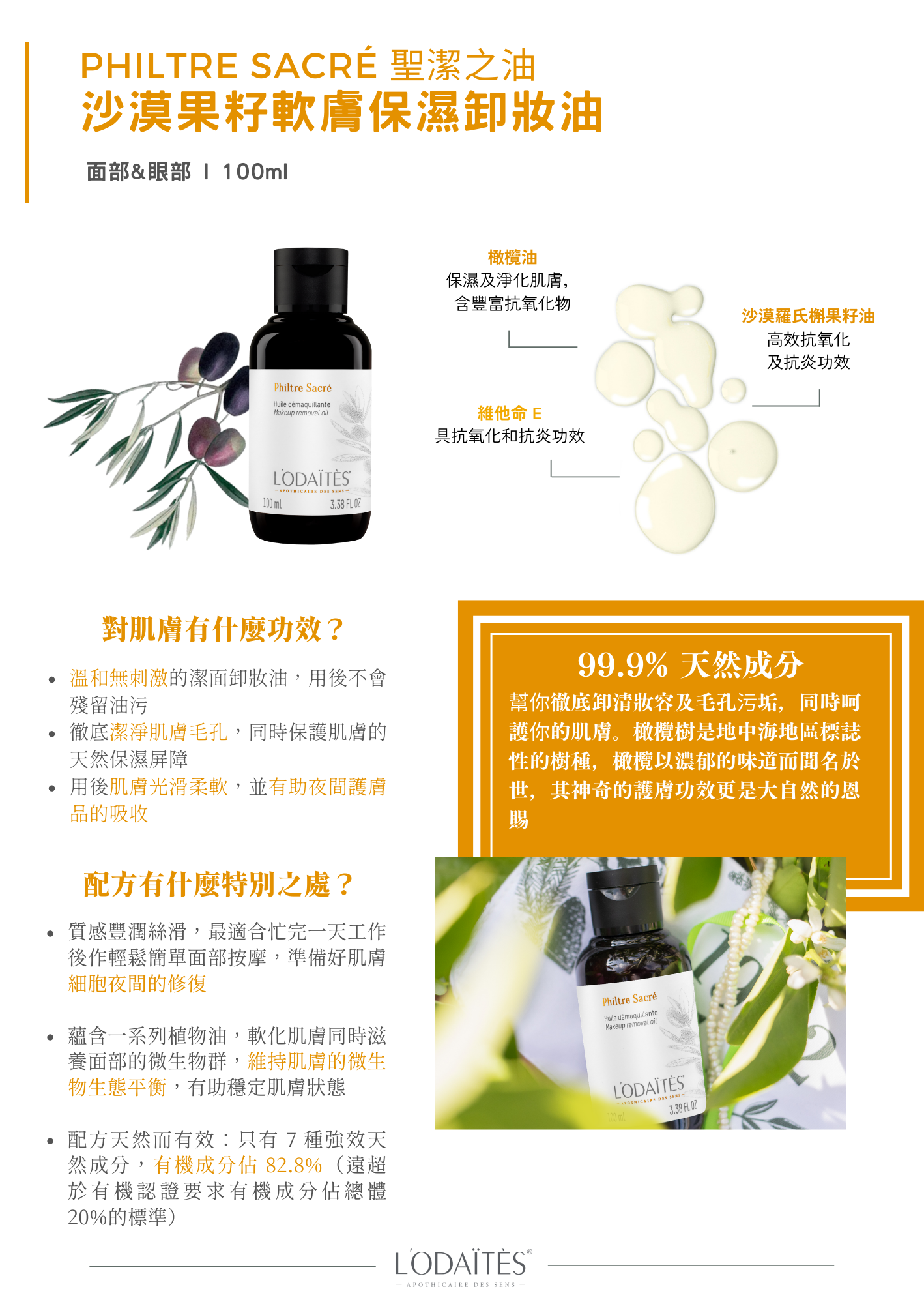 幫你徹底地卸清妝容,同時無微不至地呵護你的肌膚。使用頂級護膚植物油,橄欖樹是地中海地區標誌性的樹種,橄欖以濃郁的味道而聞名於世,其神奇的護膚功效更是大自然的恩賜。這款卸妝油就大大地印證了橄欖油的神奇功效,結合羅氏槲果籽油 (又名沙漠椰棗籽油),絲般柔滑的植物油㬭間融化所有化妝品及污垢,同時保護肌膚的天然鎖水層,質地滋潤,肌膚用後柔軟水潤。