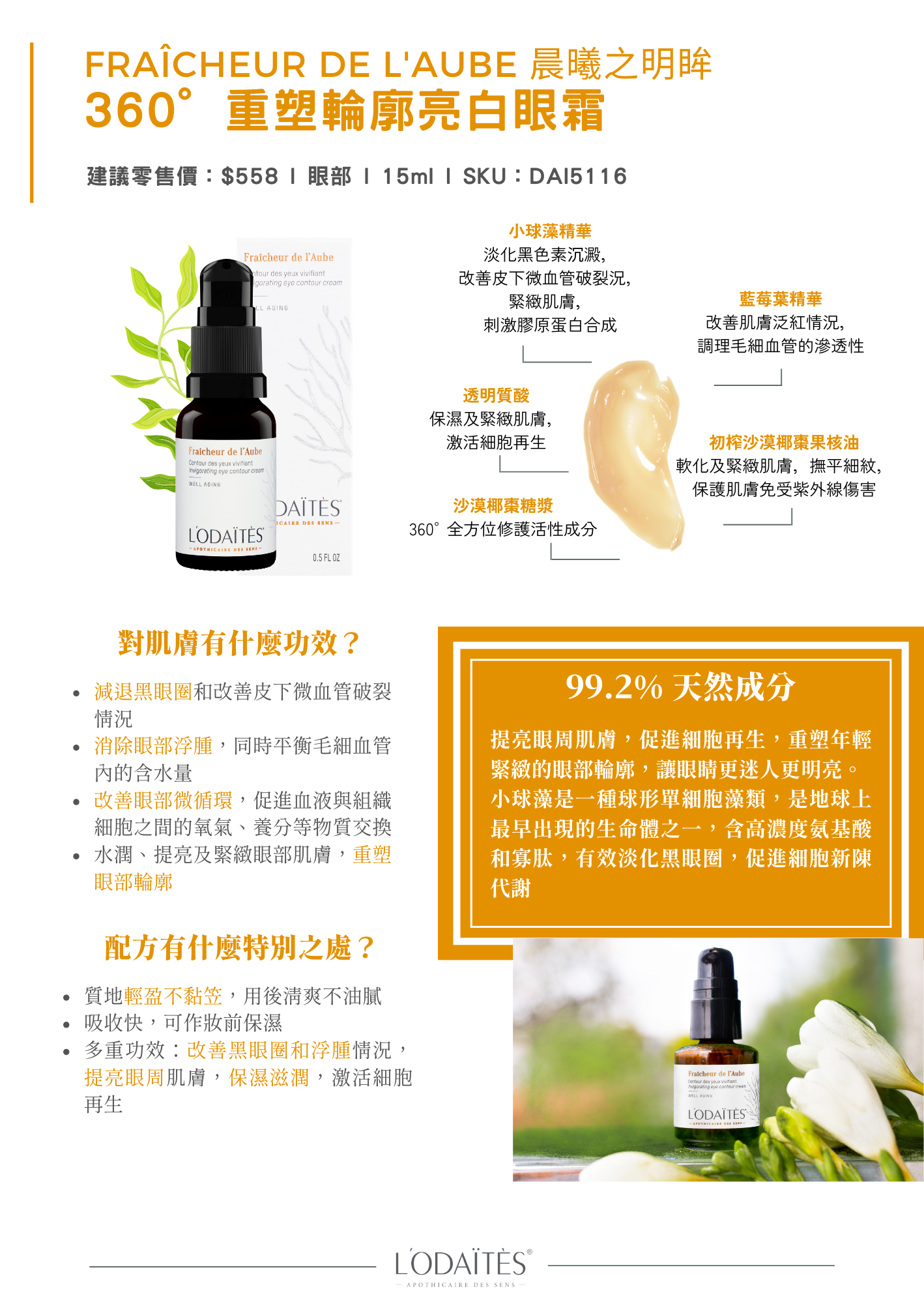 從越橘中提取的精華有助收縮血管減輕充血情況,同時亦有抗皺的功效。透明質酸與初榨沙漠椰棗果籽油相結合,為這款眼霜提供 360° 零死角的呵護,質感更是細膩易推,完全融入肌膚滋潤眼部脆弱的肌膚。