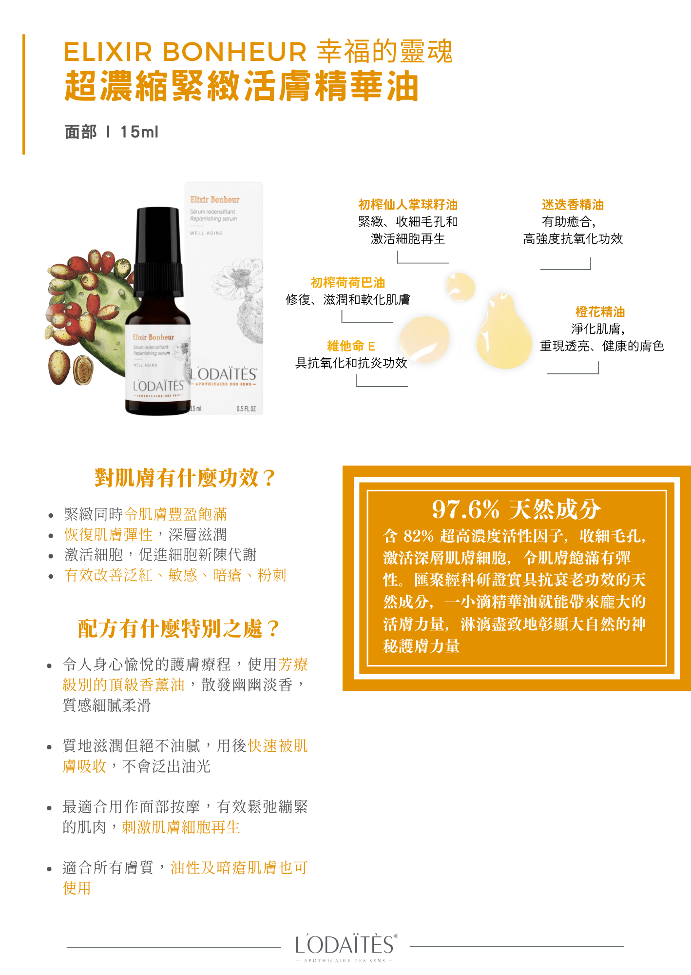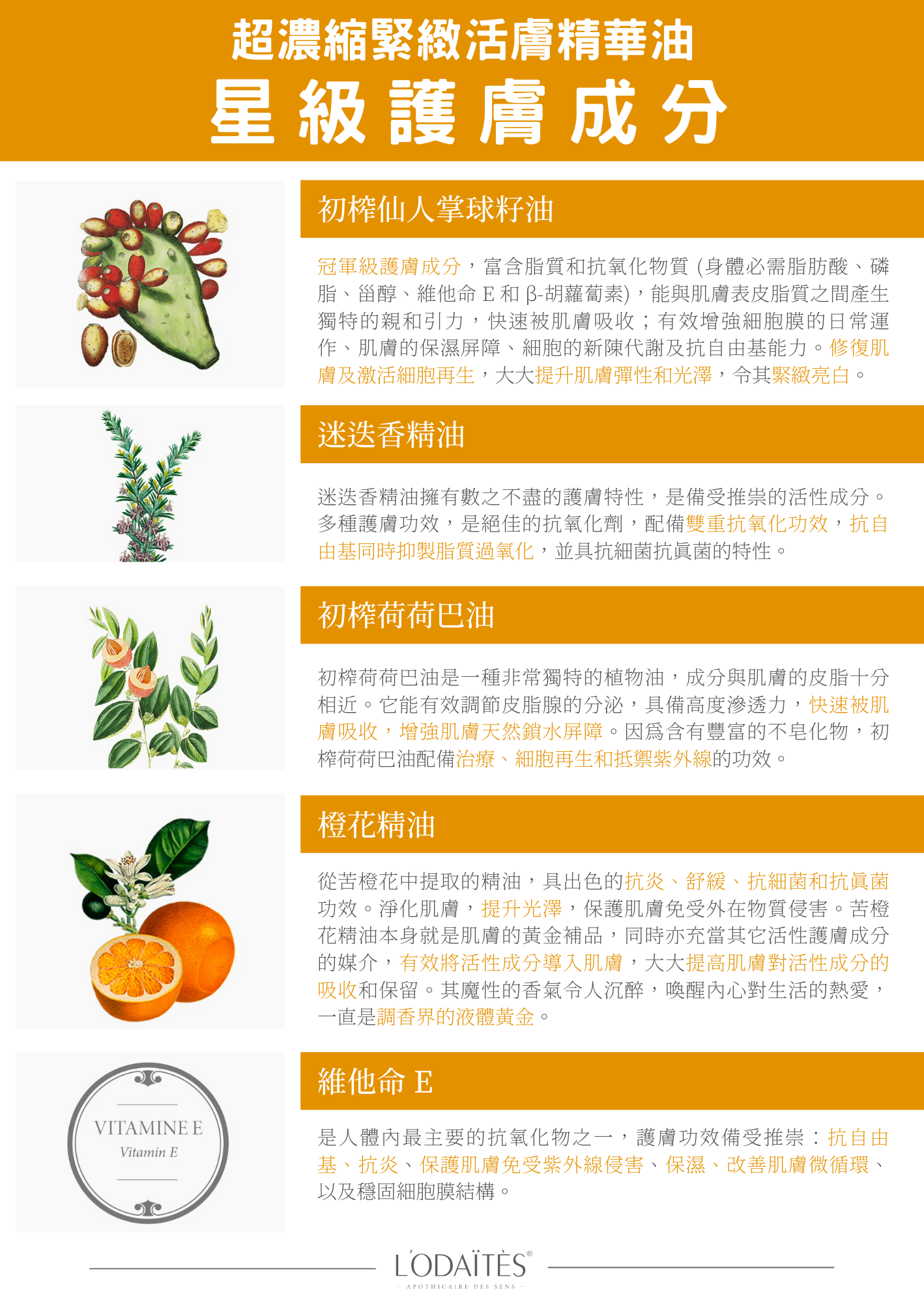 含 82% 超高濃度活性因子,收細毛孔,激活深層肌膚細胞,令肌膚飽滿有彈性。匯聚經科研證實具抗衰老功效的天然成分,一小滴精華油就能帶來龐大的活膚力量,淋漓盡致地彰顯大自然的神秘護膚力量。