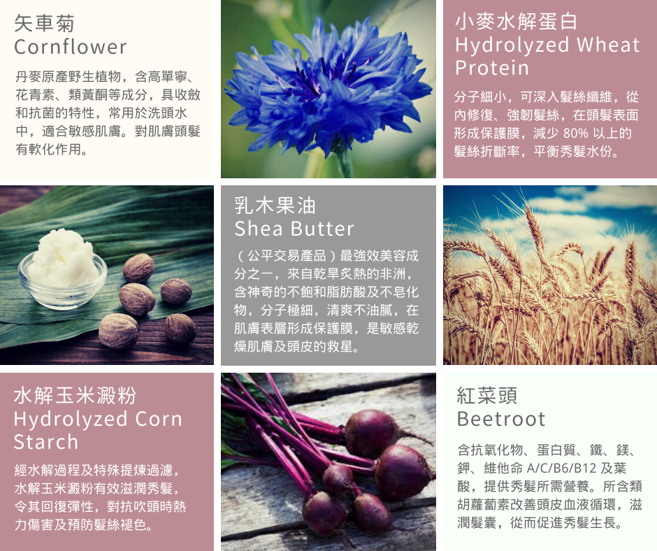 特別加入公平貿易的有機蘆薈,因其含蛋白水解酵素,有效修復頭皮壞死細胞,促進頭髮生長,性質滋潤,預防頭皮痕癢、頭屑等問題。