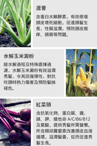成分含水解玉米澱粉及紅菜頭根部提取液,有效平衡髮絲水潤度,滋潤髮絲,改善髮質及彈性,保護秀髮免受熱力傷害及預防髮絲褪色。