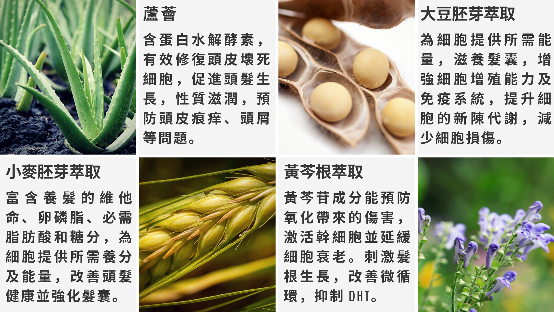 採用黃岑根、大豆胚芽和小麥胚芽萃取配製而成,強化髮囊,延緩髮囊老化,促進頭髮生長,增加頭髮密度並減少脫髮。