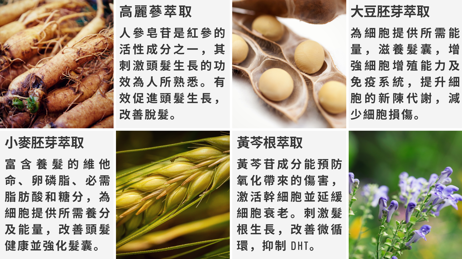 採用高麗蔘、黃岑根、大豆胚芽和小麥胚芽萃取配製而成,強化髮囊,延緩髮囊老化,促進頭髮生長,增加頭髮密度並減少脫髮。