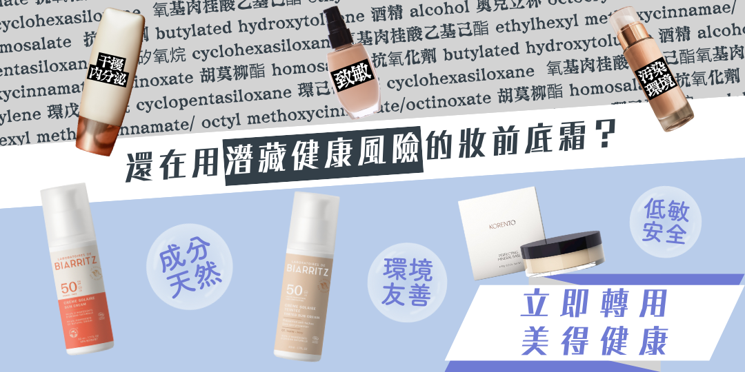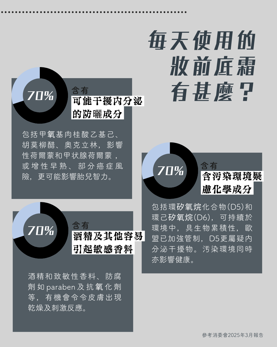 但傳統妝前底霜中有時加入 高濃度酒精、香料、甚至某些防曬劑,有研究指出高達八成五 標榜防曬效果的底霜含有可能干擾內分泌的成分,對皮膚與身體健康帶來潛在風險。