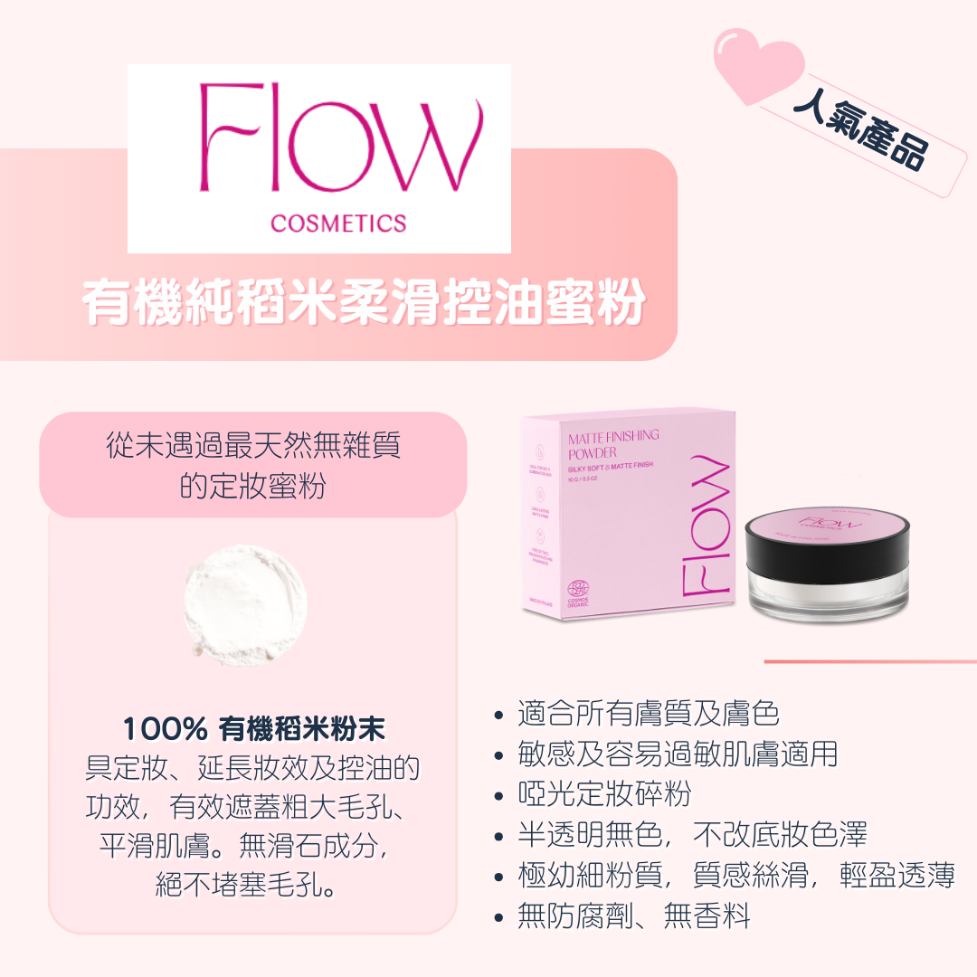 想擁有自然柔光透亮效果? 可選擇同系列 Flow Cosmetics 柔光透亮天然定妝蜜粉(Radiant版)。