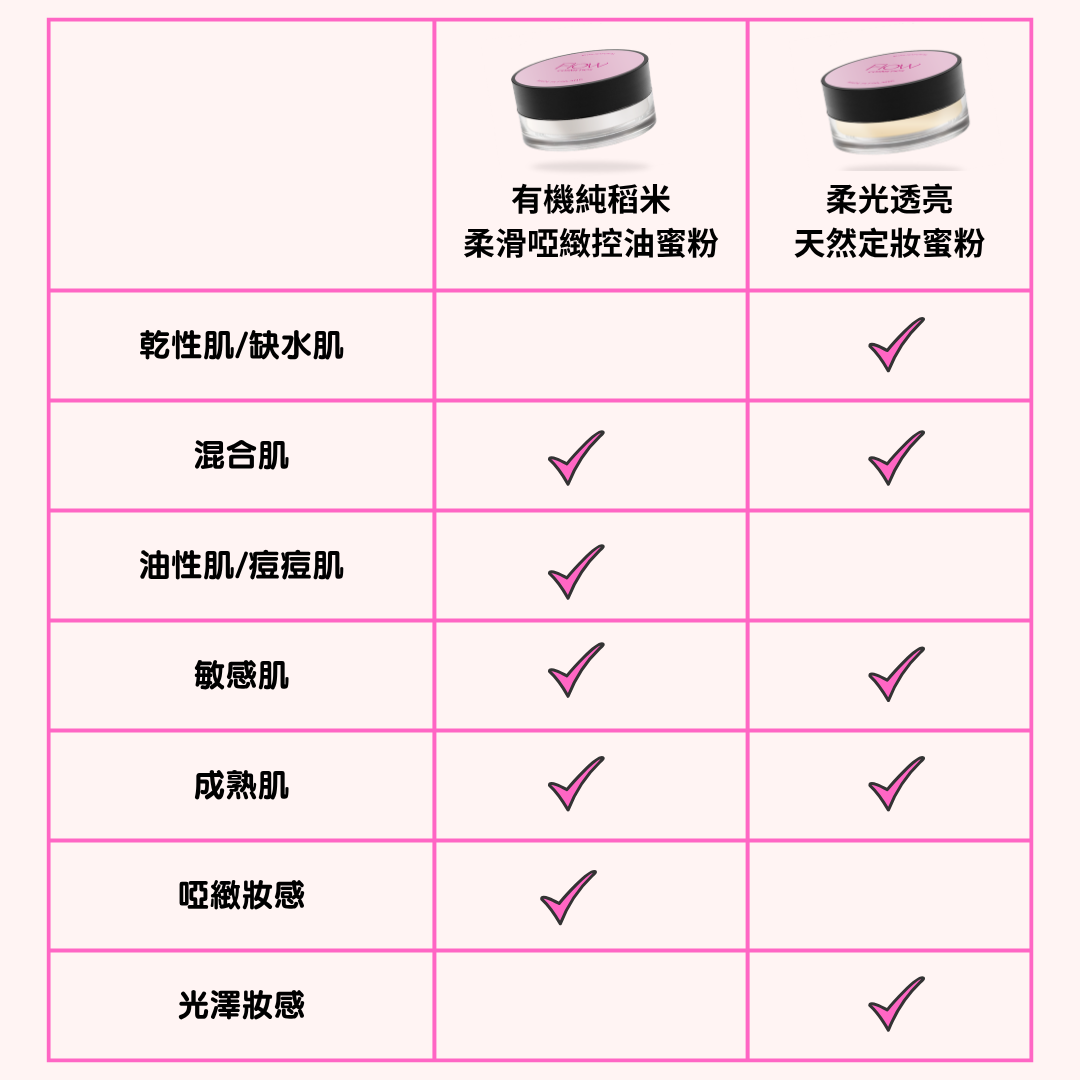 這支 100% 有機天然純素、talc-free 無滑石 的定妝蜜粉,以極微細有機稻米粉末製成,質地輕盈透氣(breathable)、半透明無色(translucent & colorless),不堵塞毛孔,特別適合 油性肌、痘肌(acne-prone)、混合肌及敏感肌使用。能有效控油(oil-controlling)、持久定妝、柔焦毛孔,打造絲絨般的啞光妝感。