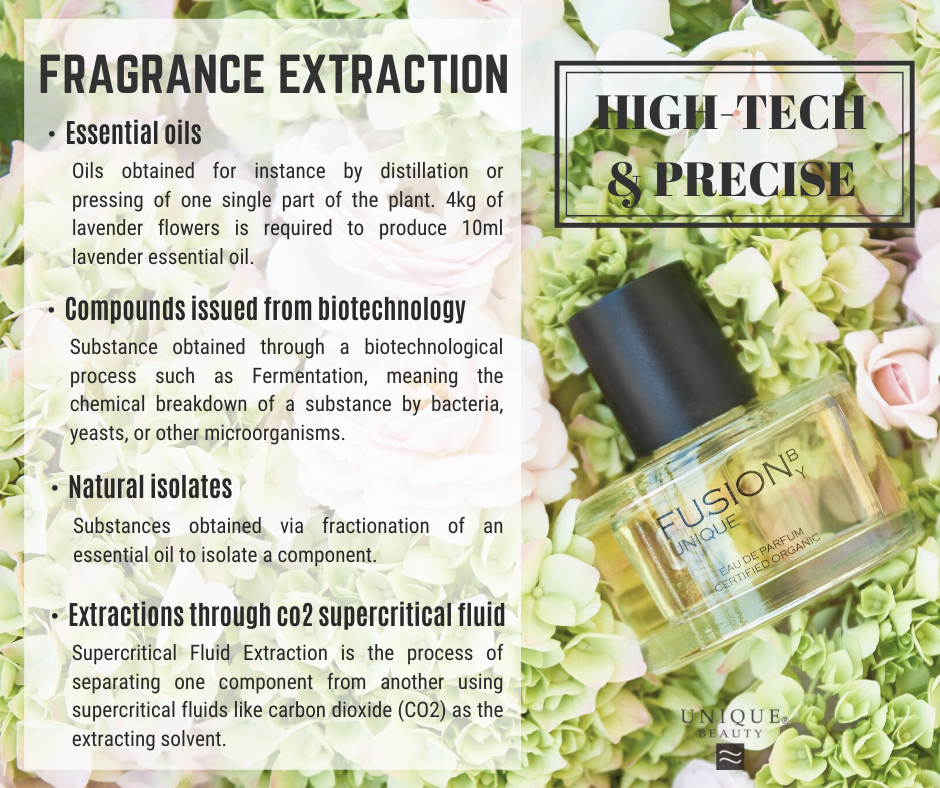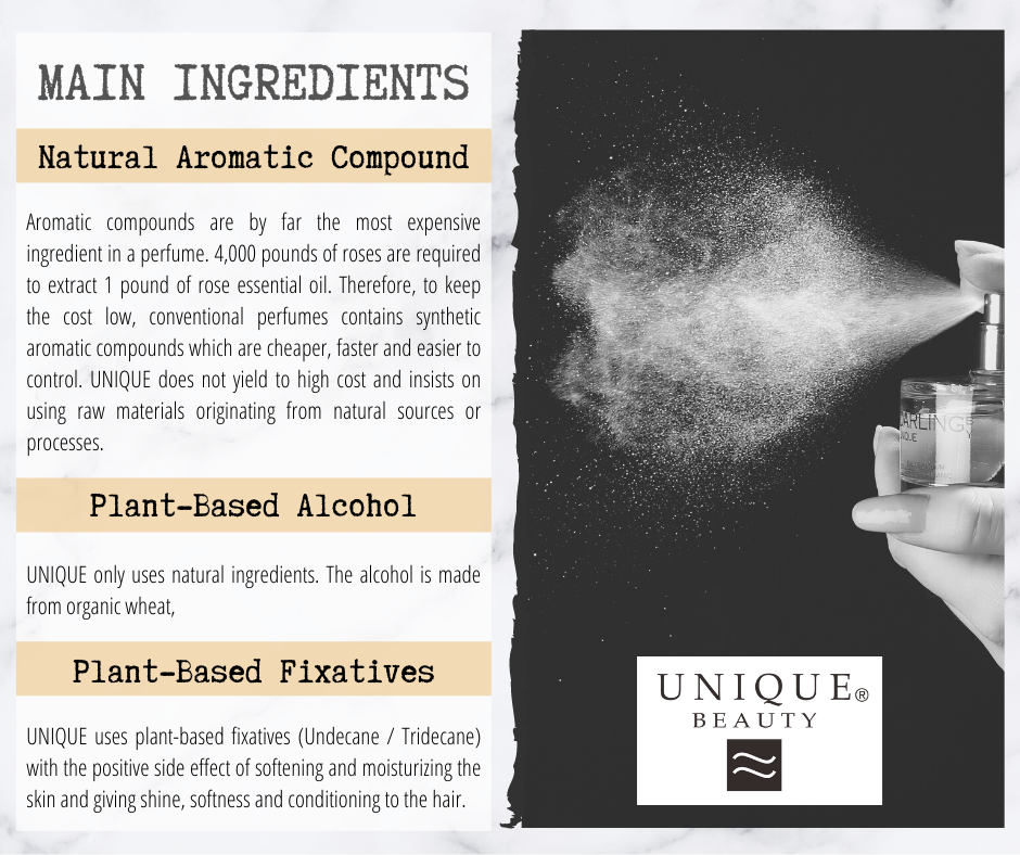 UNIQUE perfumes are 100% natural with ingredients such as flowers, grasses, leaves, fruits, wood, roots and seeds. Even the alcohol and fixatives are derived from plants. UNIQUE uses high-tech fragrance extraction to break essential oils and other substances into hundreds of fragrance parts, and thus makes it possible to make more sophisticated organic fragrances that do not smell of essential oils but smell more like conventional perfumes.